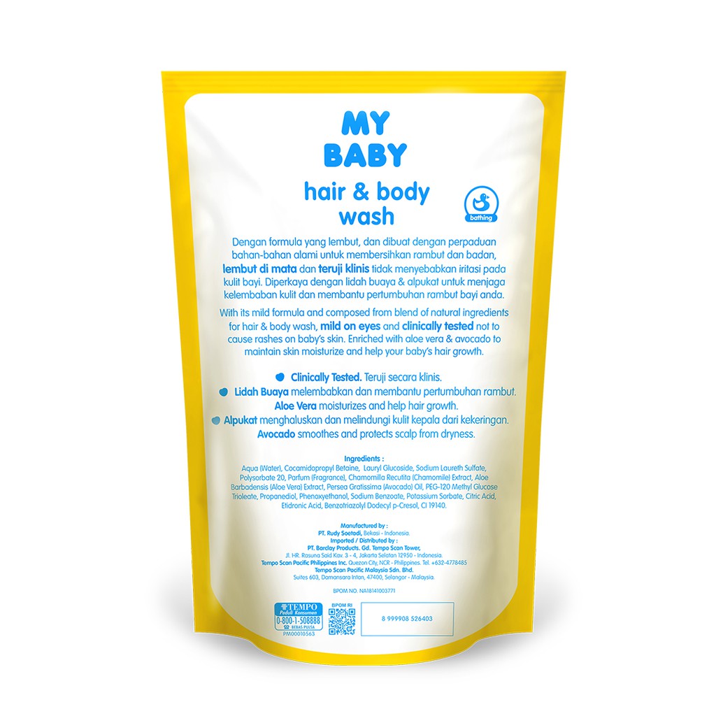Bersihkan rambut dan badan si kecil tanpa menimbulkan iritasi dengan MY BABY Hair & Body Wash Aloe Vera & Avocado 400 ml. Hadir dengan formula yang sudah teruji secara klinis sehingga aman bagi si kecil.